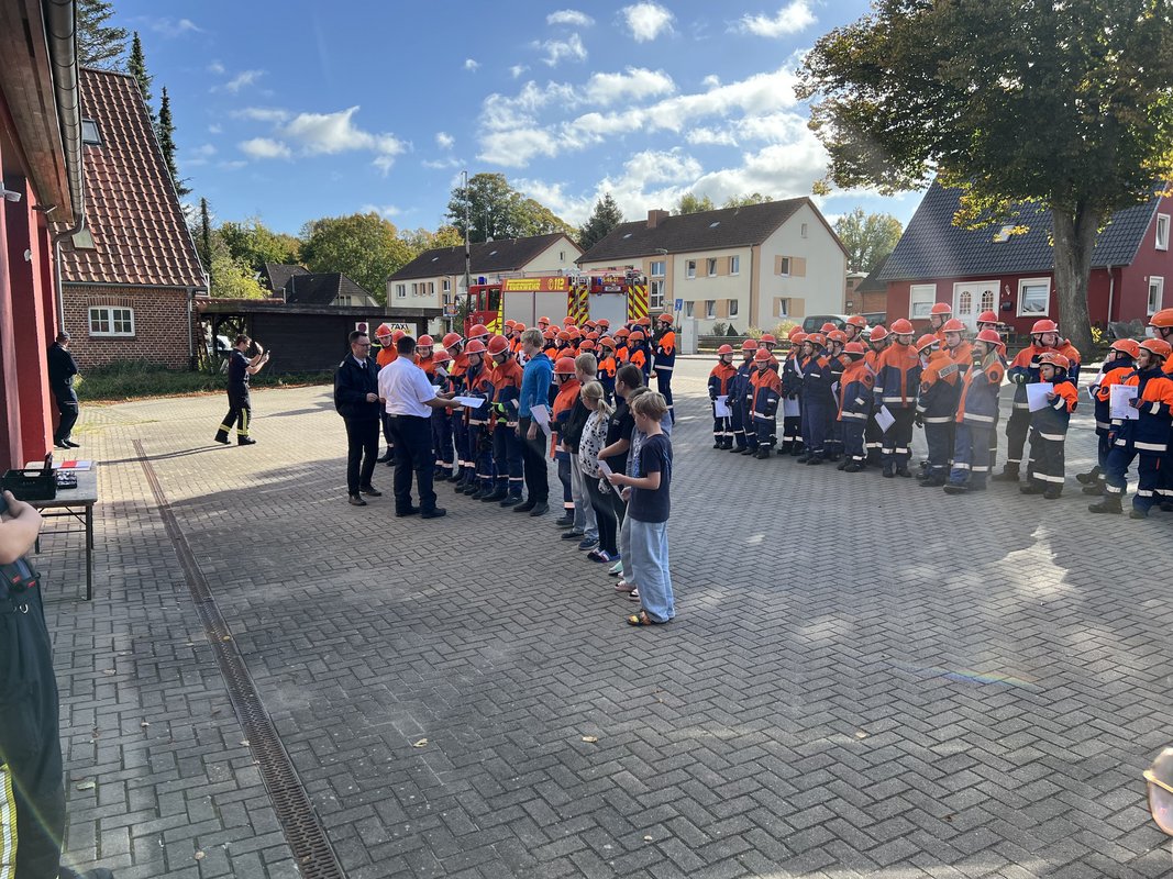 Am Samstag stand dann noch die Abnahme der Jugendflamme Stufe 1 - 3 gemeinsam mit den Jugendfeuerwehren des Amtes Lensahn und der Gemeinde Grömitz an.