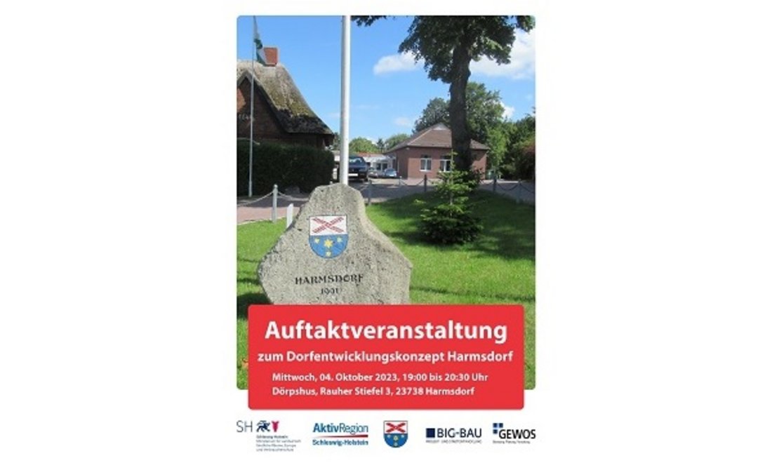 Am Mittwoch, 04.10.2023 findet von 19.00 - 20.30 Uhr die Auftaktveranstaltung zum Dorfentwicklungskonzept Harmsdorf im Dörpshus, Rauher Stiefel 3, 23738 Harmsdorf statt.